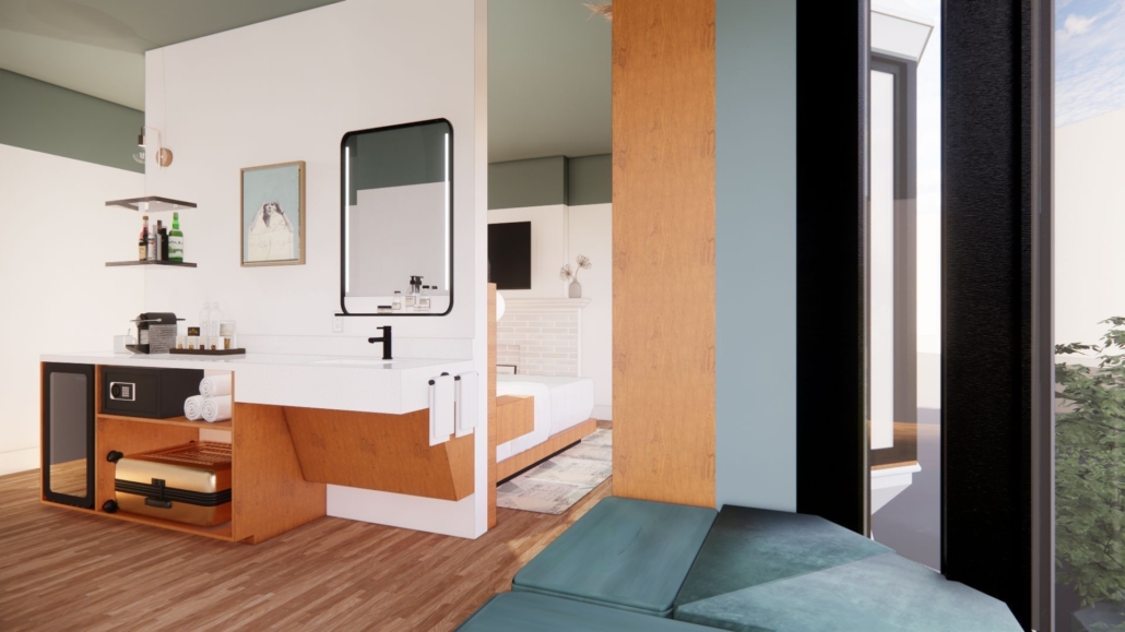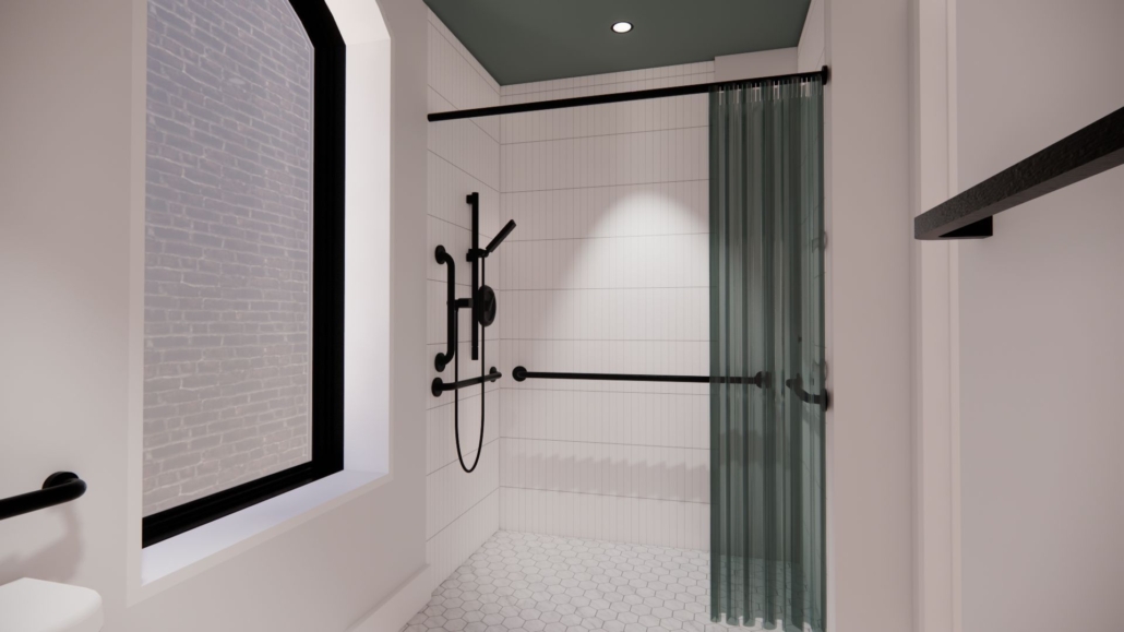 A fully accessible room with two, large bay windows and a decorative hearth overlooking Baxter Avenue. Room has our signature plush king size bed, 55″ smart TV, mini-fridge, coffee station, full length mirror, and complimentary Wi-Fi. Bathroom has a roll-in shower and premium bath amenities.