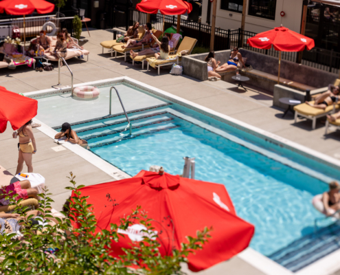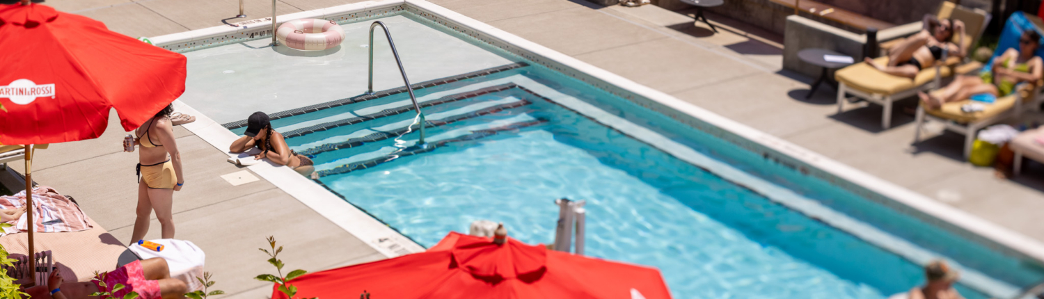 While lounge chair access is limited, hotel guests are always welcome at Myriad Swim Club,